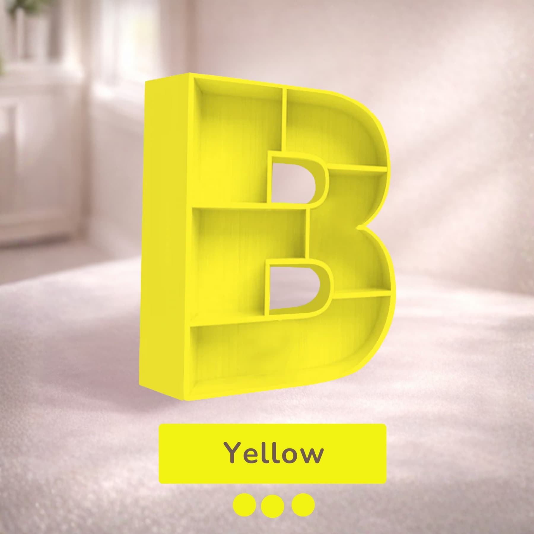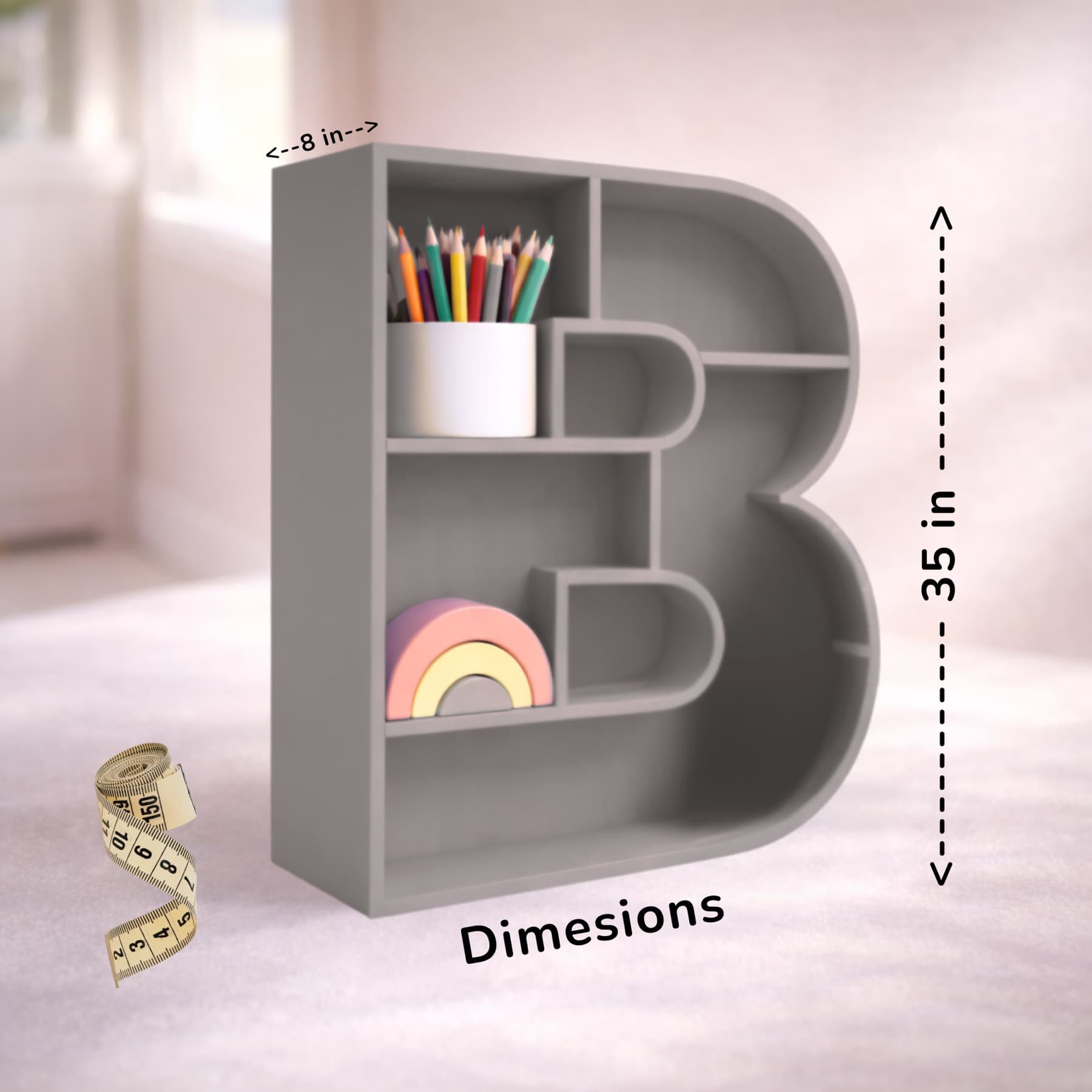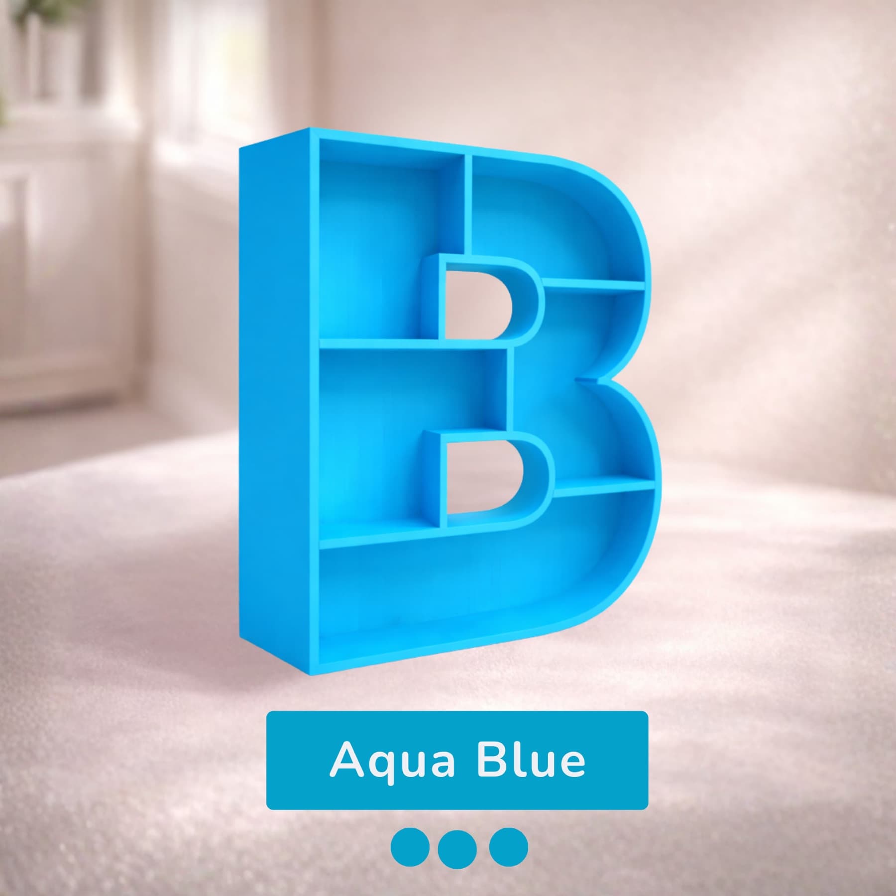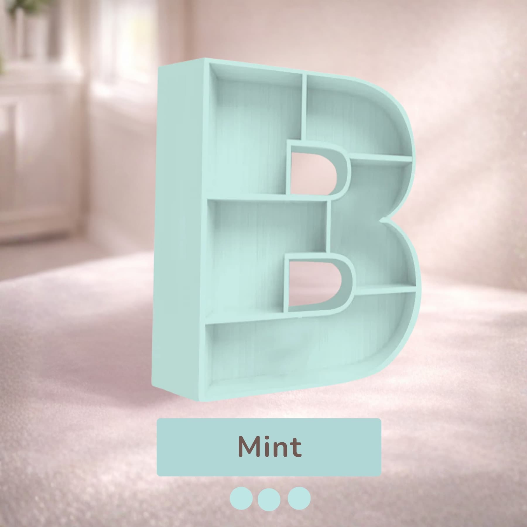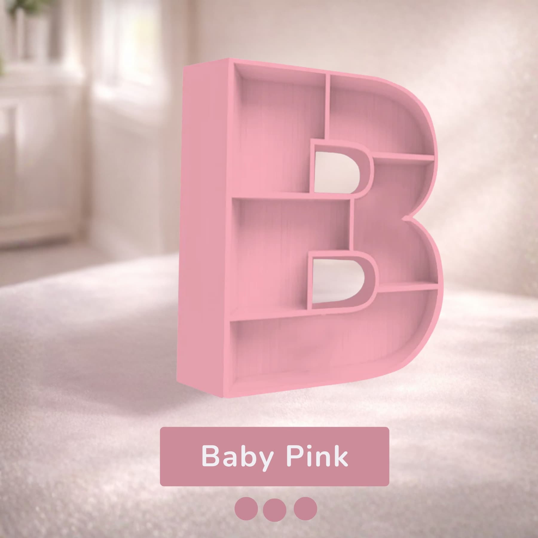 A beautifully handcrafted letter B shaped shelf, perfect for displaying books, toys, and keepsakes. Made from solid wood with a smooth finish, available in 8 stunning pastel colors. Each shelf is unique and adds a personalised touch to any kids' room or nursery.