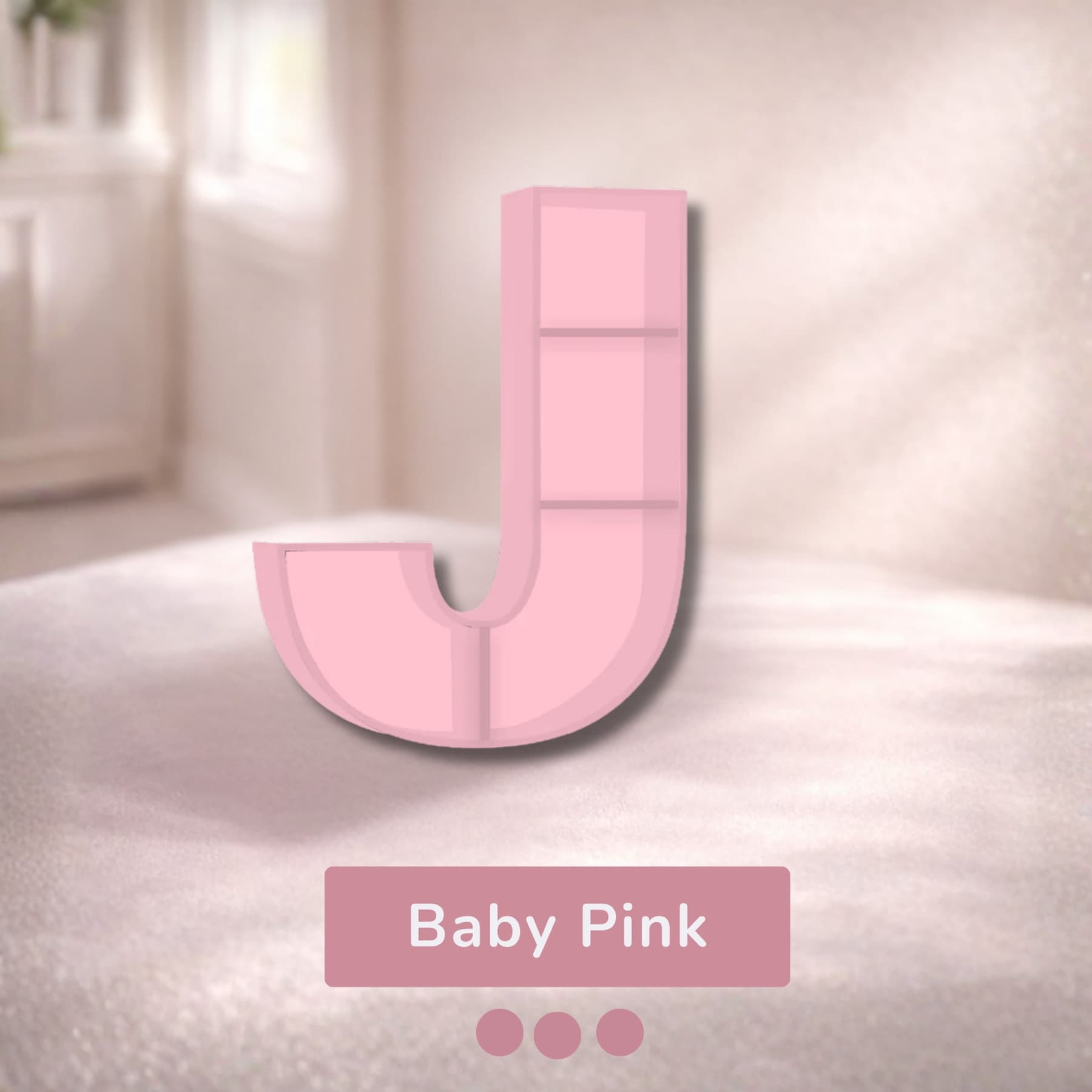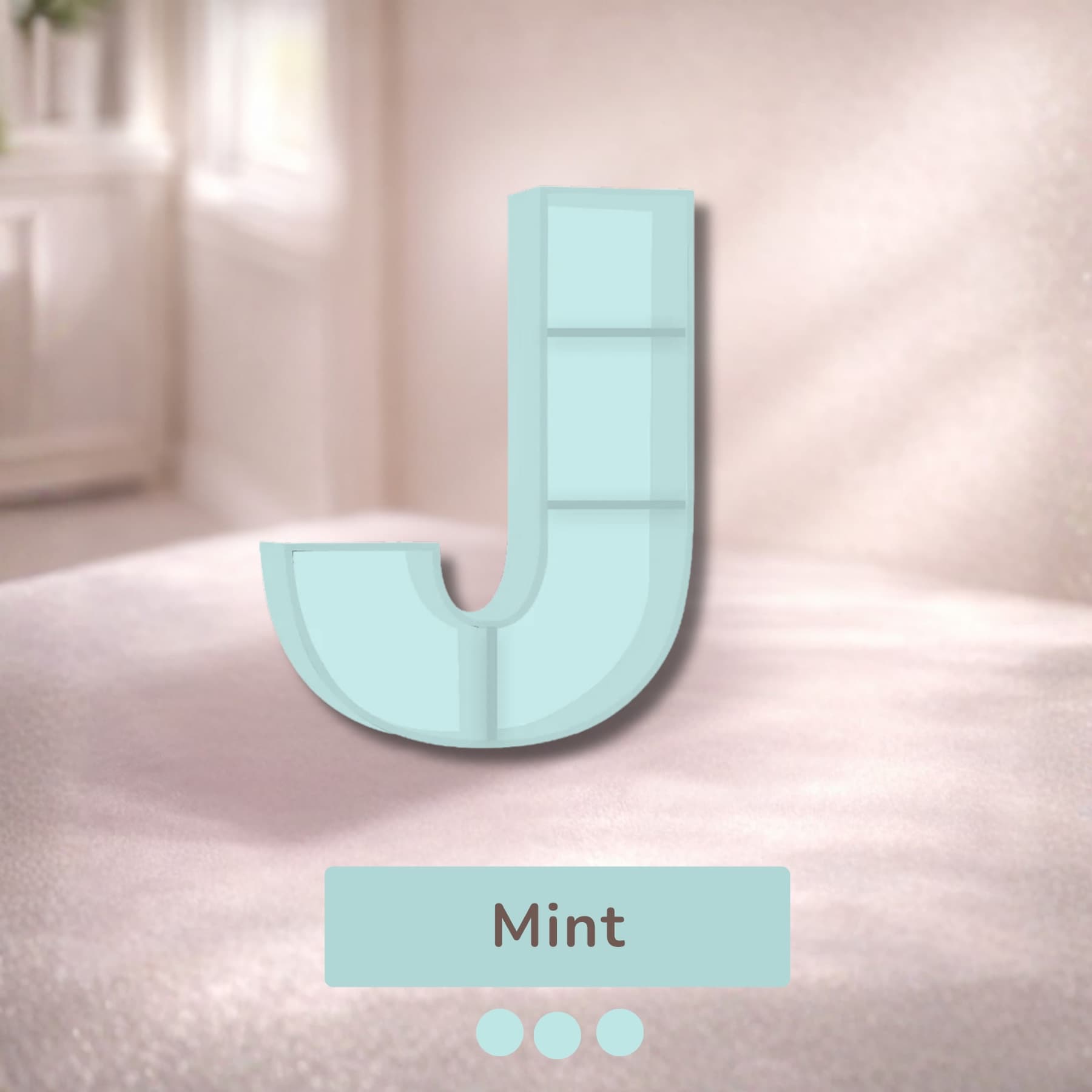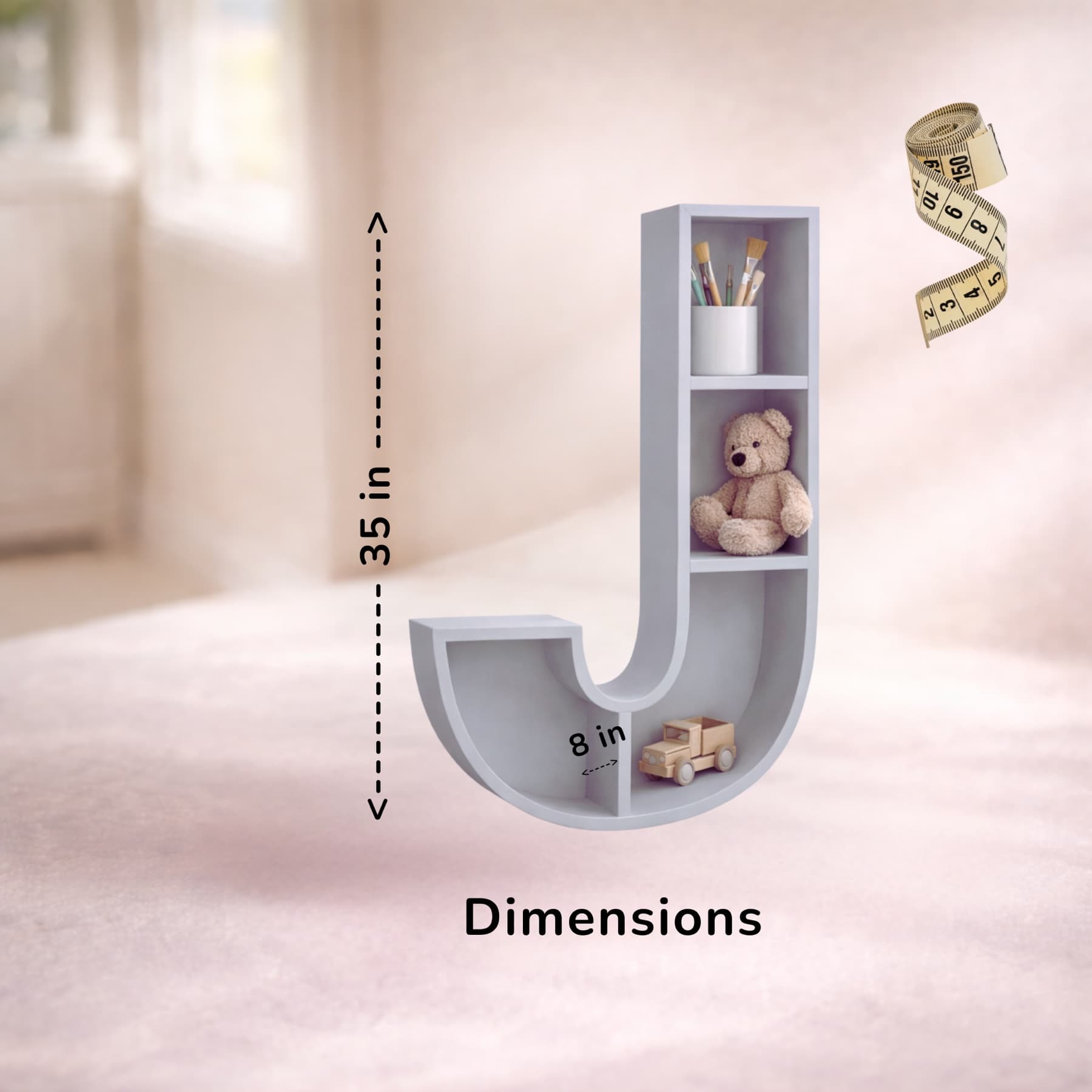 A beautifully handcrafted letter J shaped shelf, perfect for displaying books, toys, and keepsakes. Made from solid wood with a smooth finish, available in 8 stunning pastel colors. Each shelf is unique and adds a personalised touch to any kids' room or nursery.