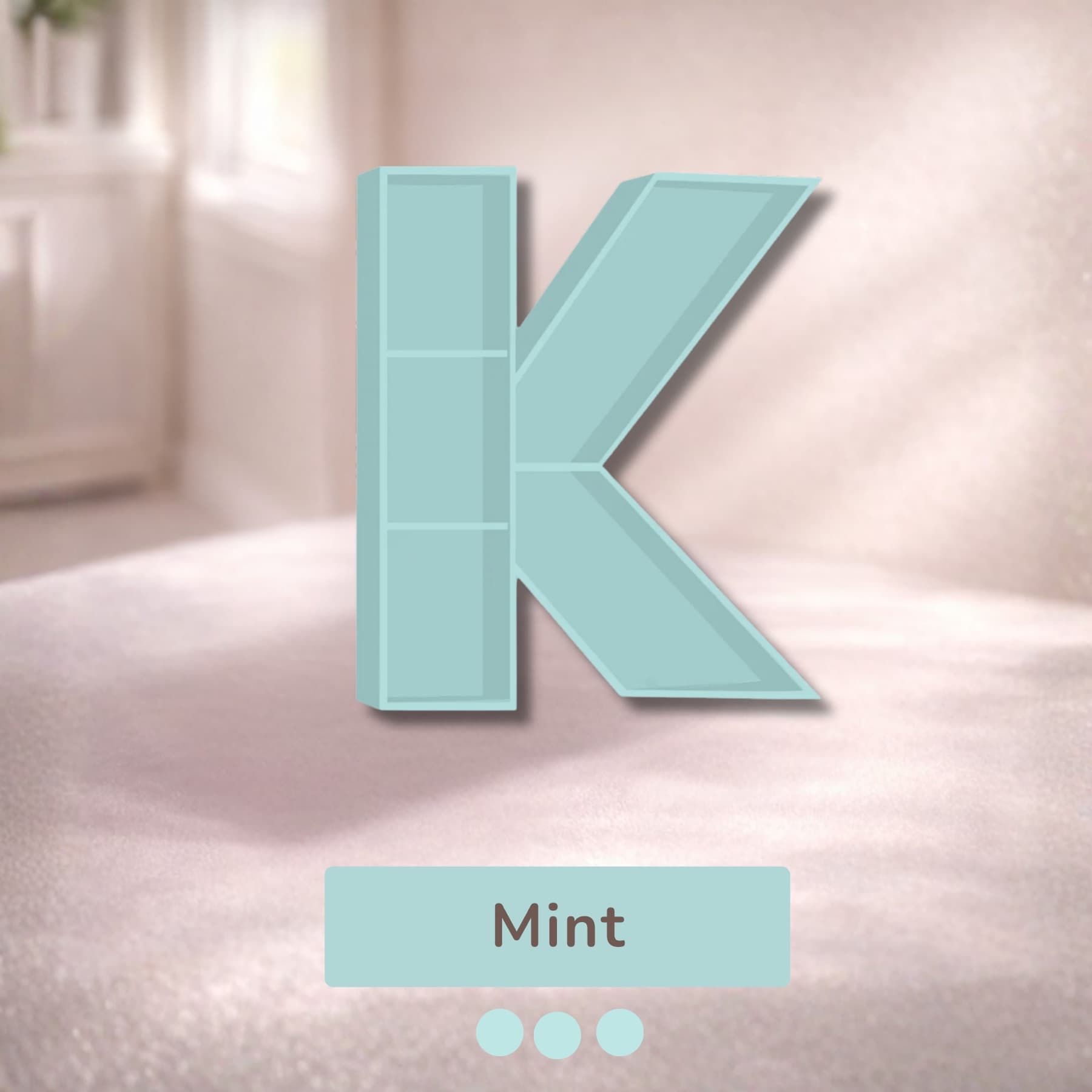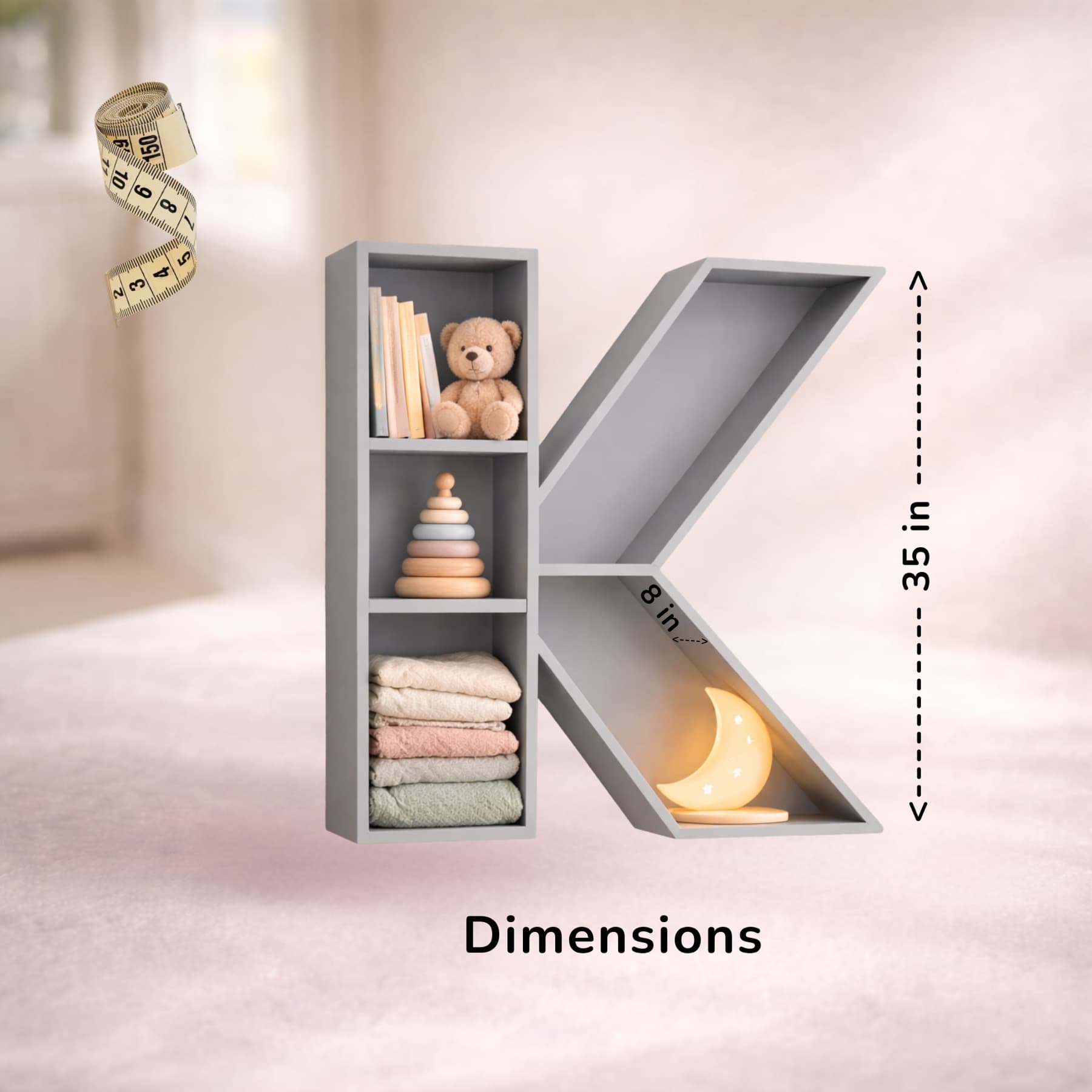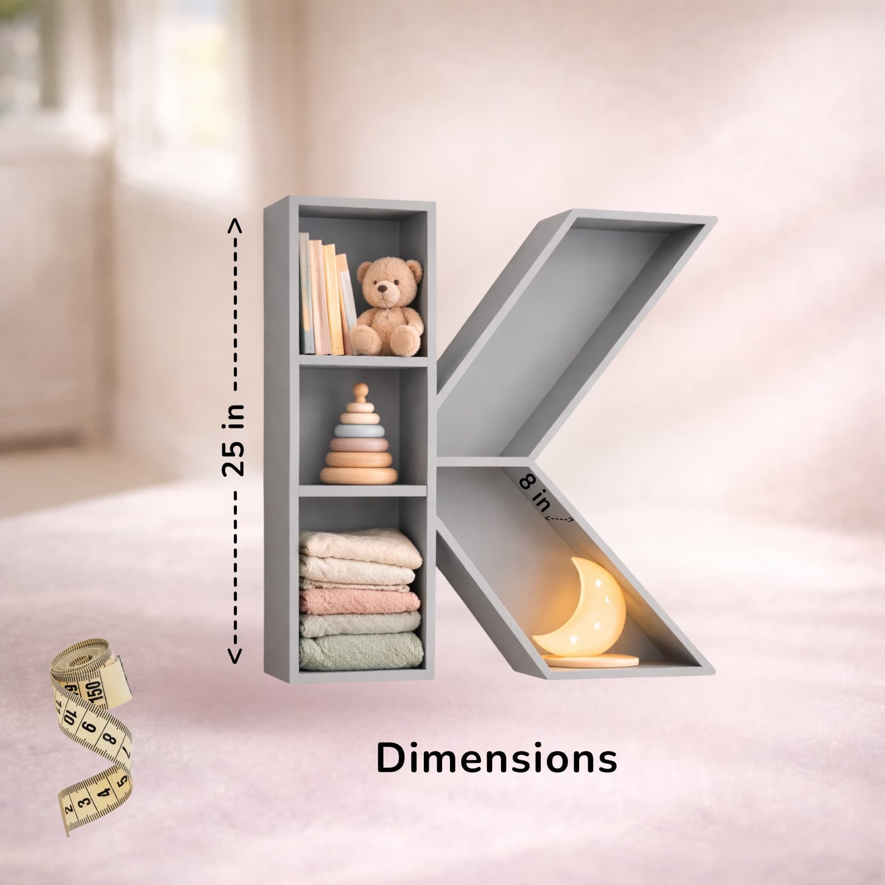 A beautifully handcrafted letter K shaped shelf, perfect for displaying books, toys, and keepsakes. Made from solid wood with a smooth finish, available in 8 stunning pastel colors. Each shelf is unique and adds a personalised touch to any kids' room or nursery.