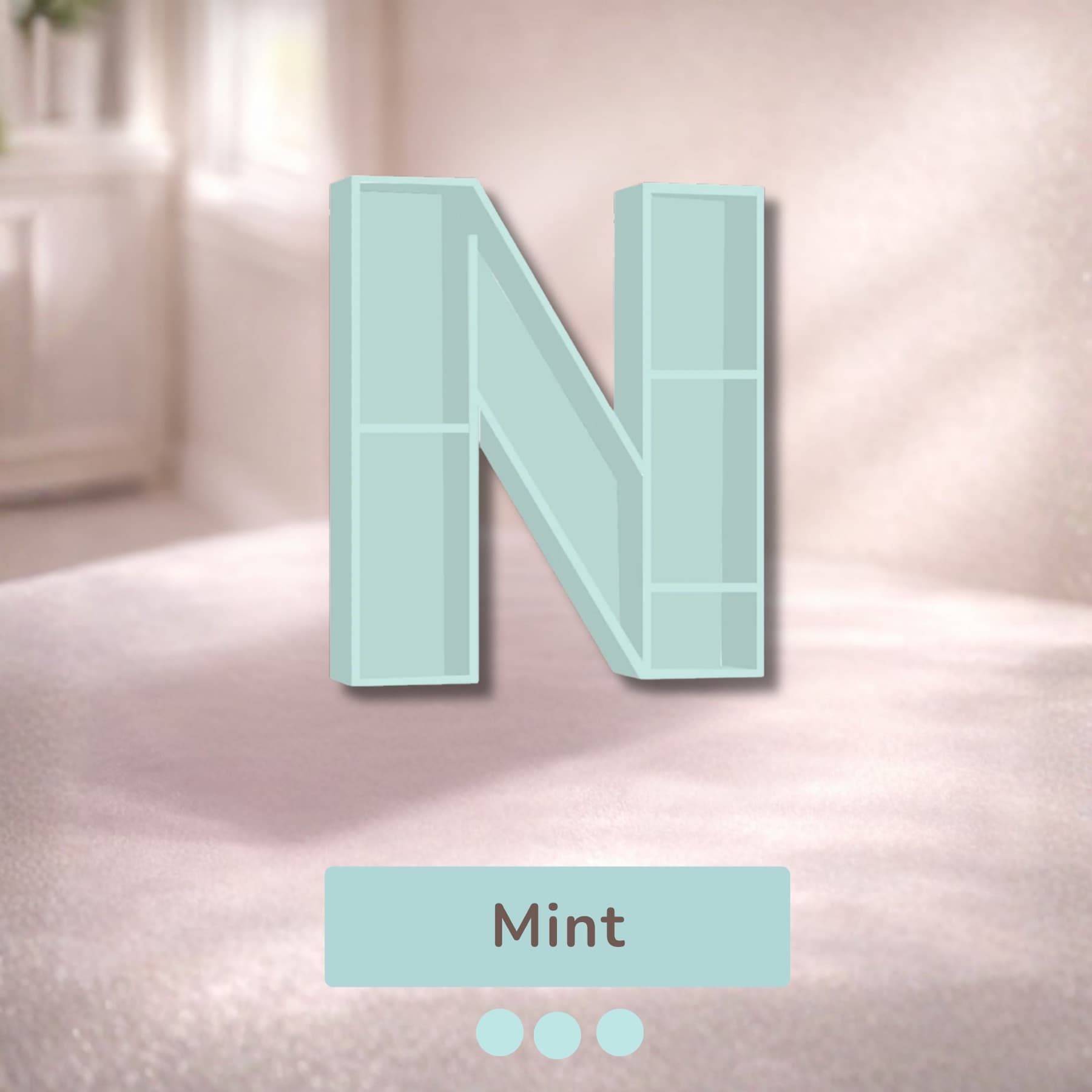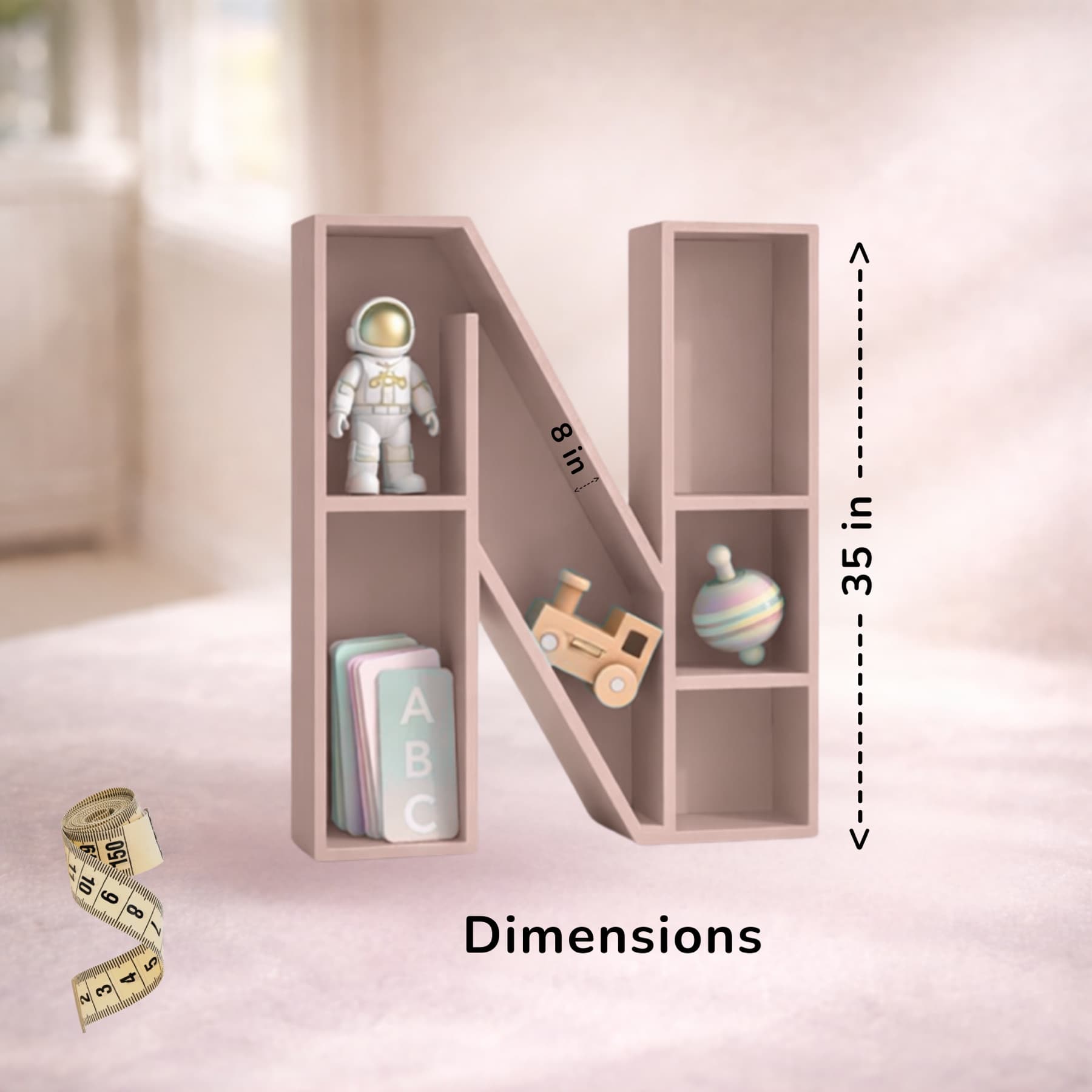 A beautifully handcrafted letter N shaped shelf, perfect for displaying books, toys, and keepsakes. Made from solid wood with a smooth finish, available in 8 stunning pastel colors. Each shelf is unique and adds a personalised touch to any kids' room or nursery.
