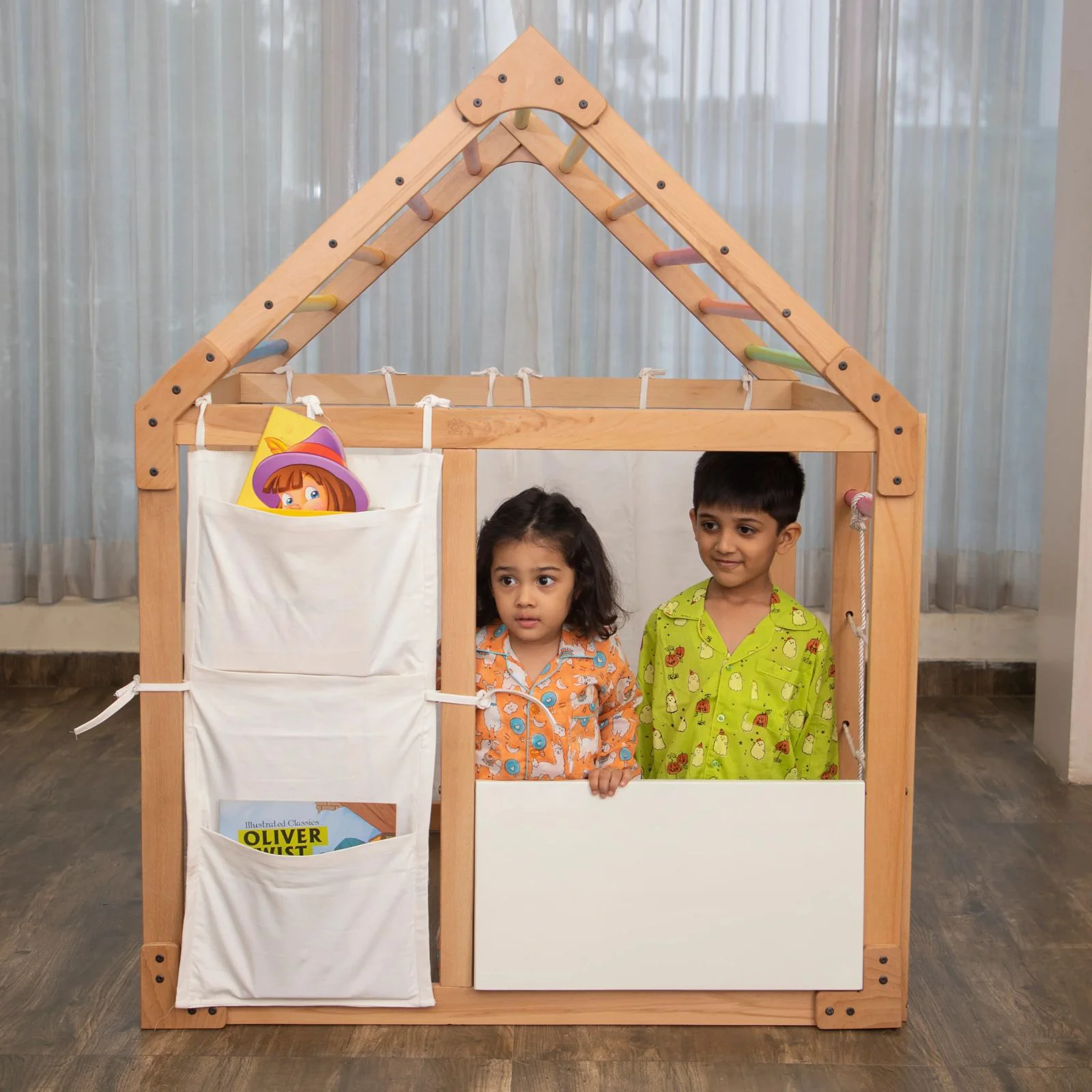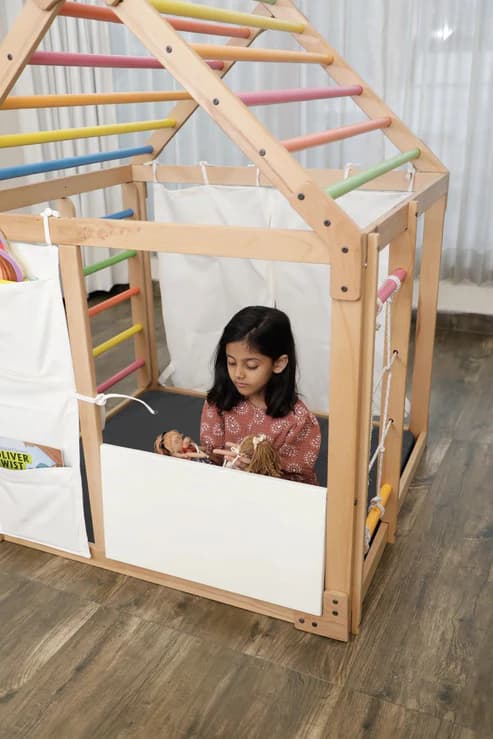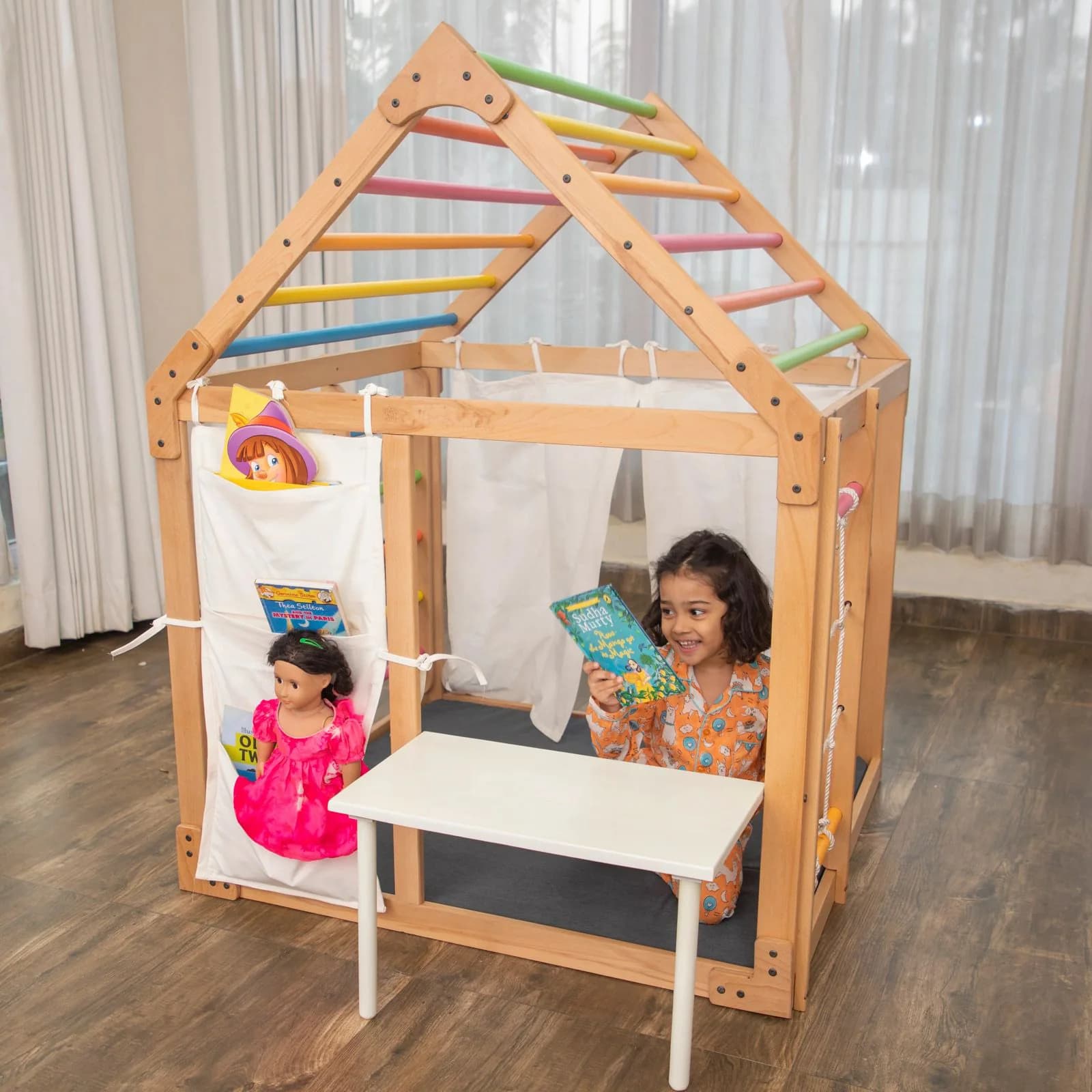 A compact indoor gym and playhouse that encourages physical and mental development with various play features.