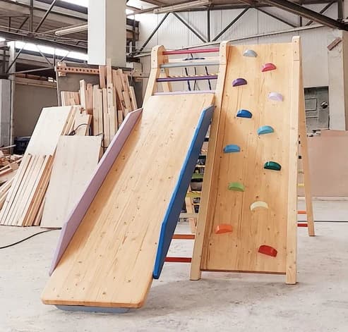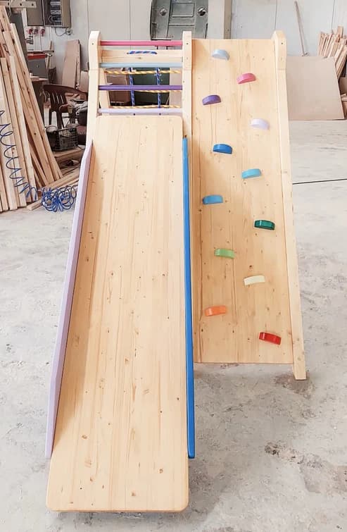 A sturdy, handmade wooden double climber with slide, perfect for kids aged 2–6 for indoor and outdoor play.