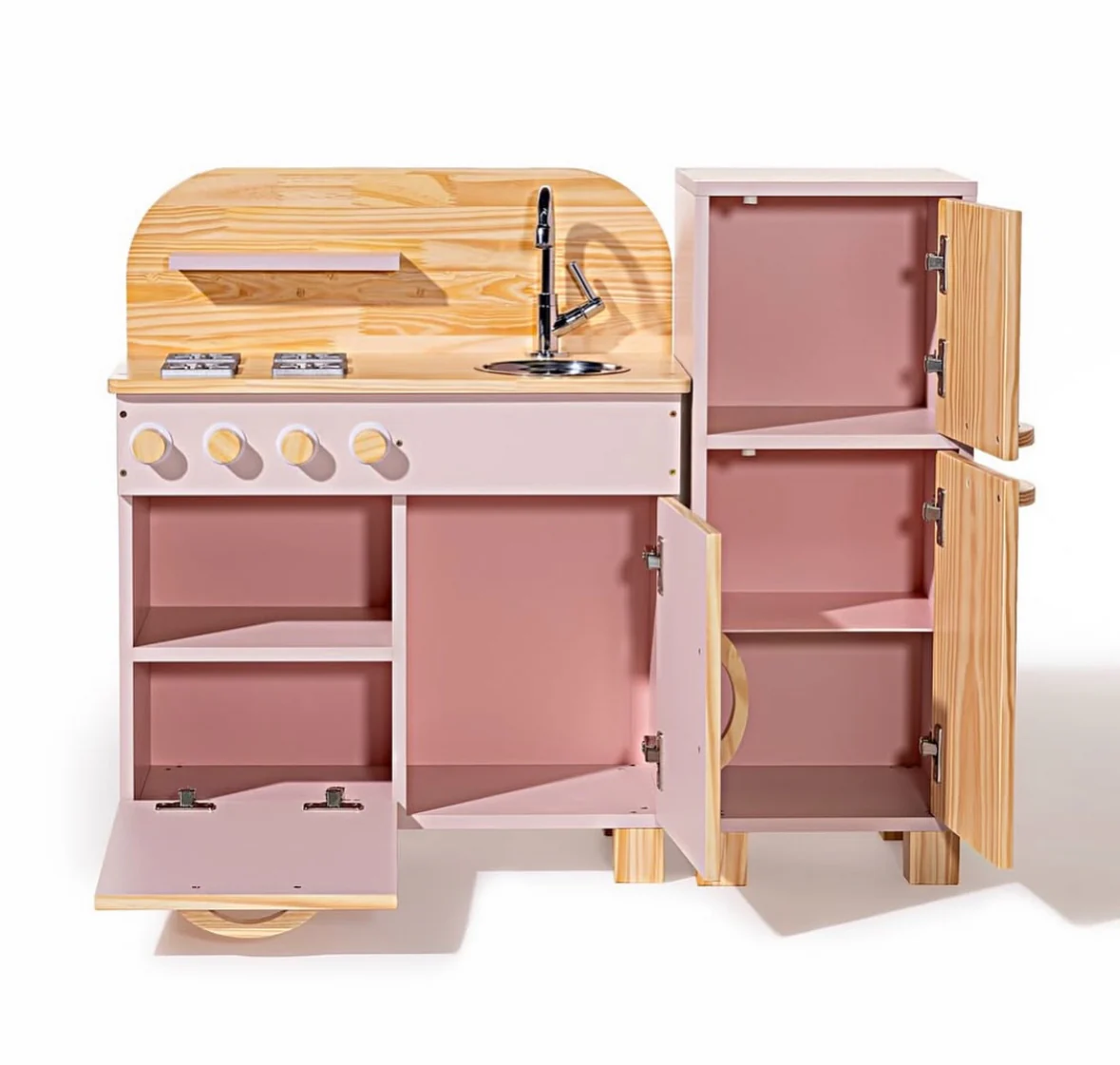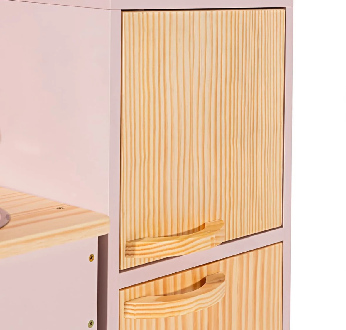 Charming wooden play kitchen with matching refrigerator, crafted from MDF and pine wood with a smooth Duco finish—perfect for hours of imaginative cooking and pretend groceries.