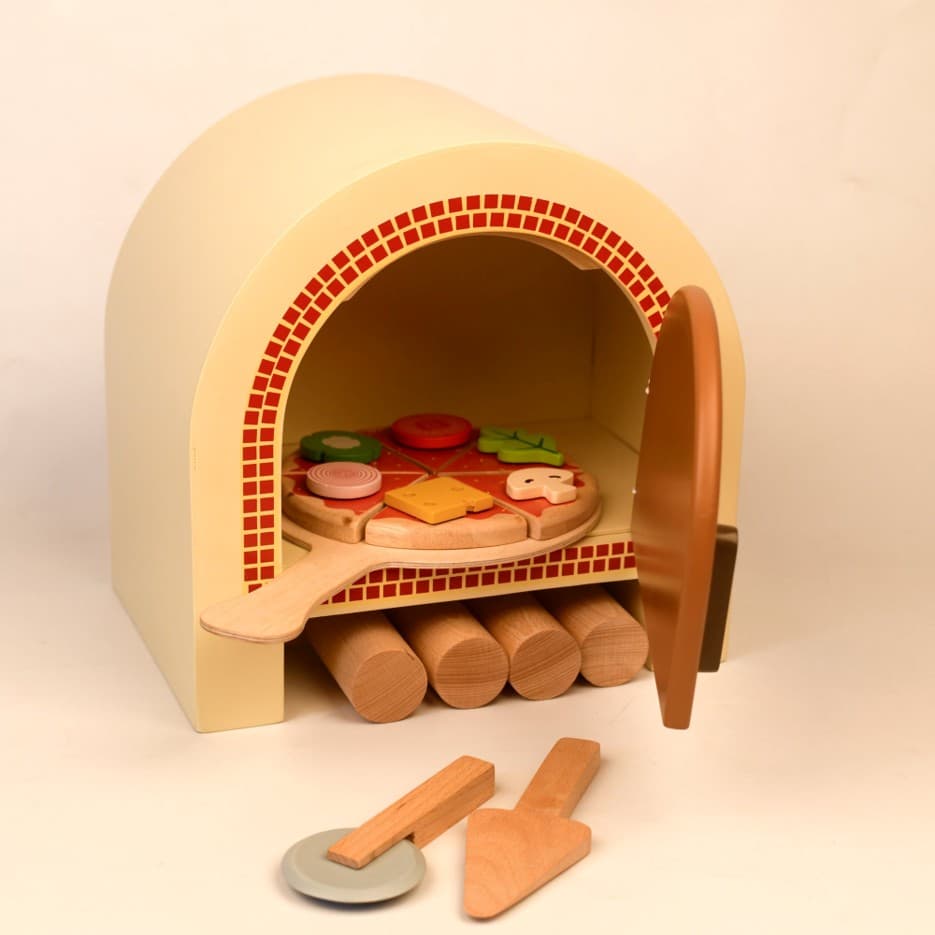 A fun wooden pizza oven playset that lets kids bake, slice, and serve their own pretend pizzas – the perfect recipe for creative play.