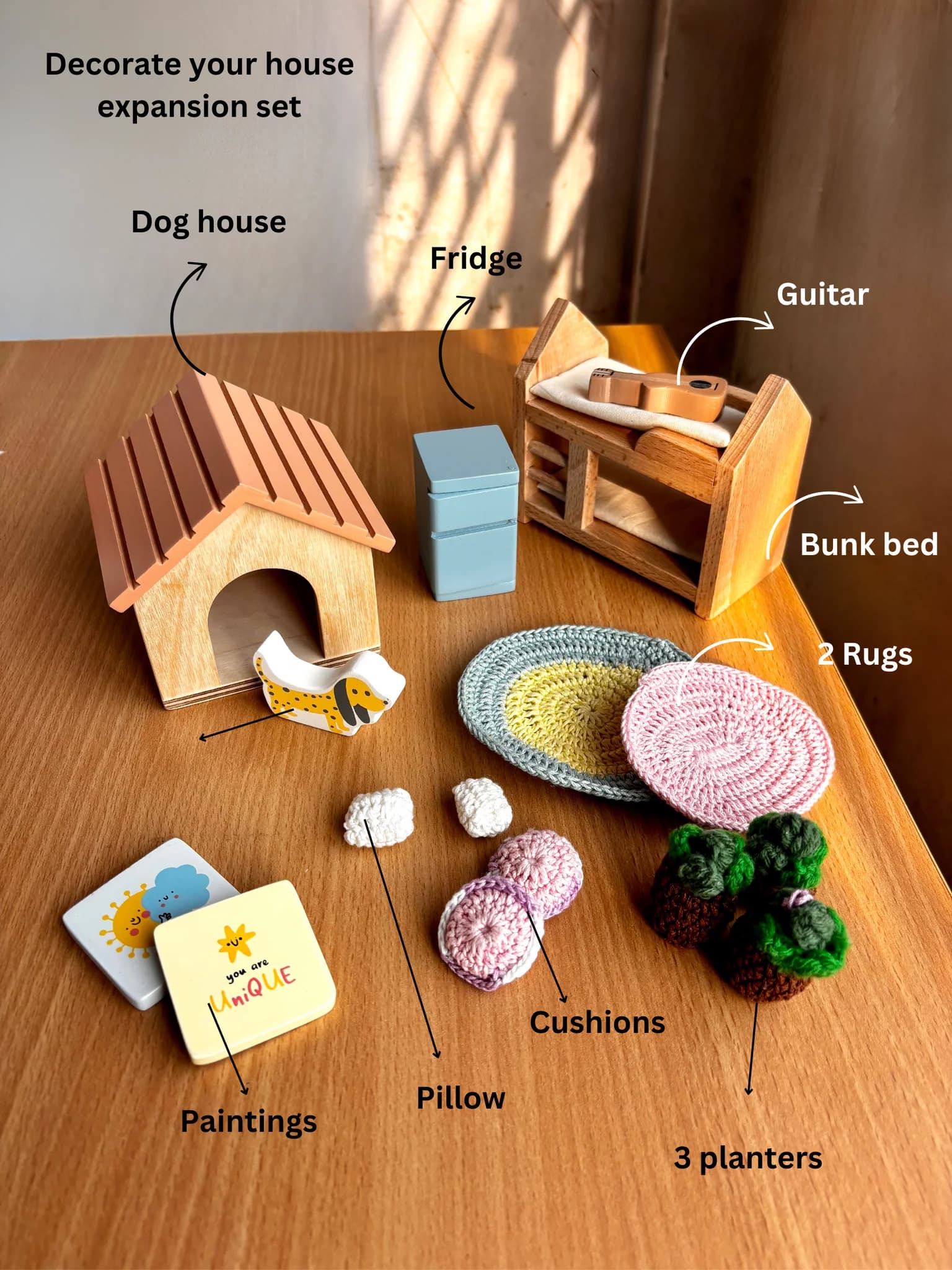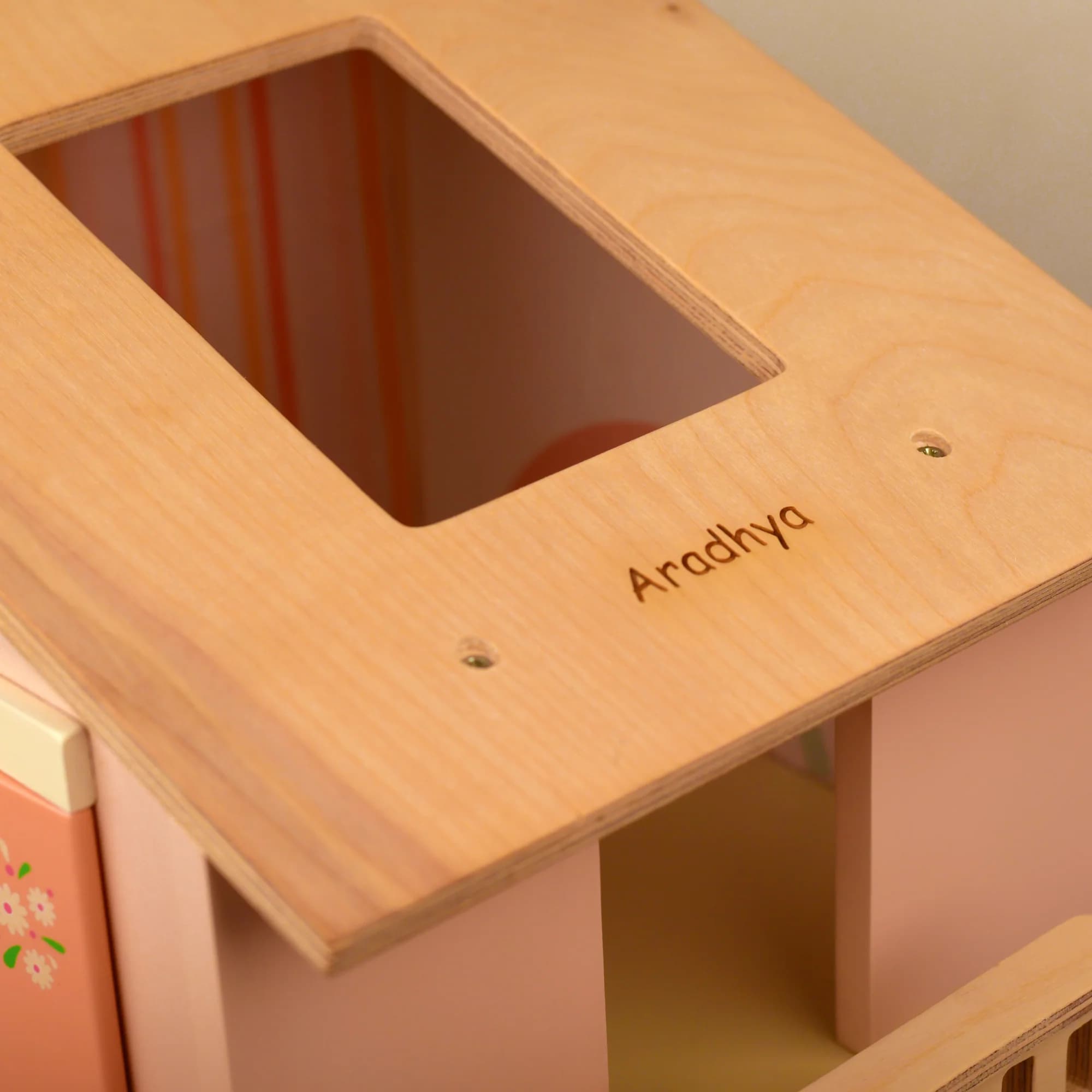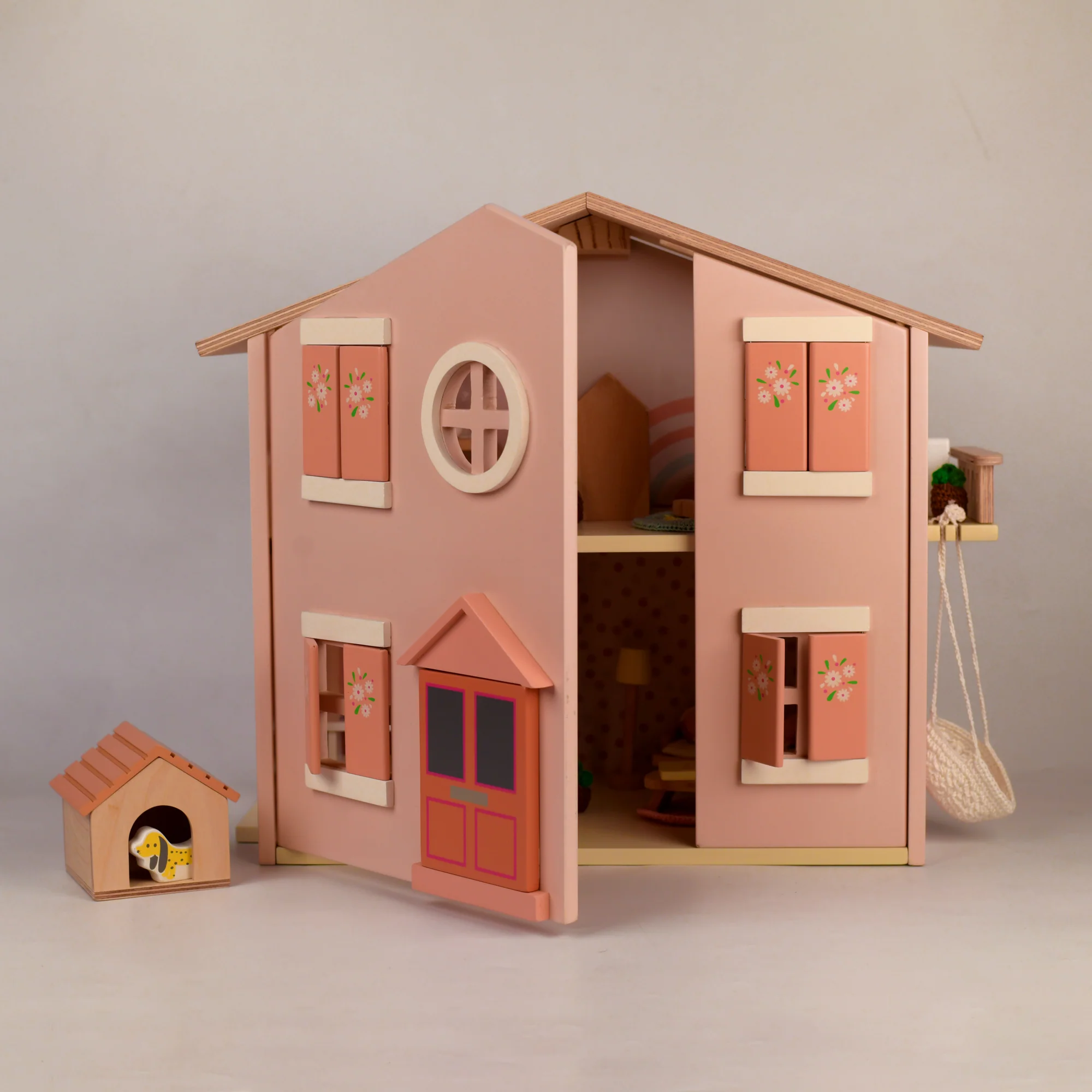 A beautifully crafted wooden dollhouse in pastel pink with floral accents, functional shutters, and child-safe finish, perfect for imaginative play.