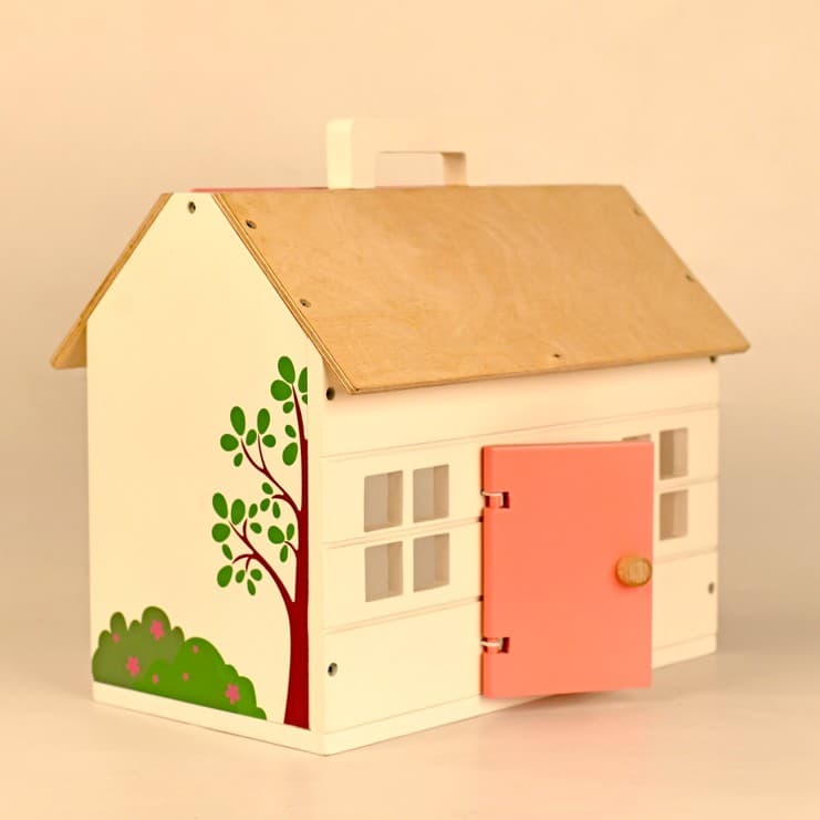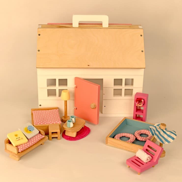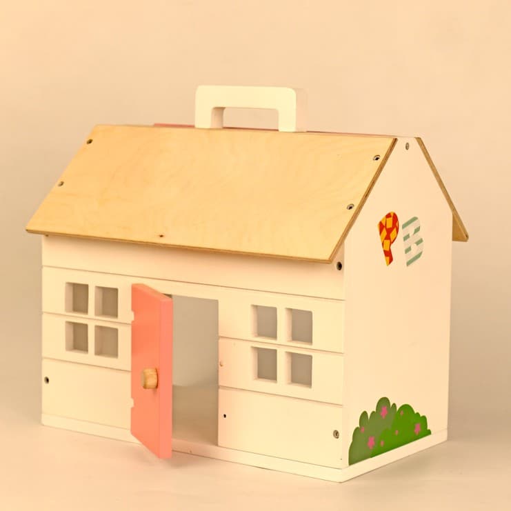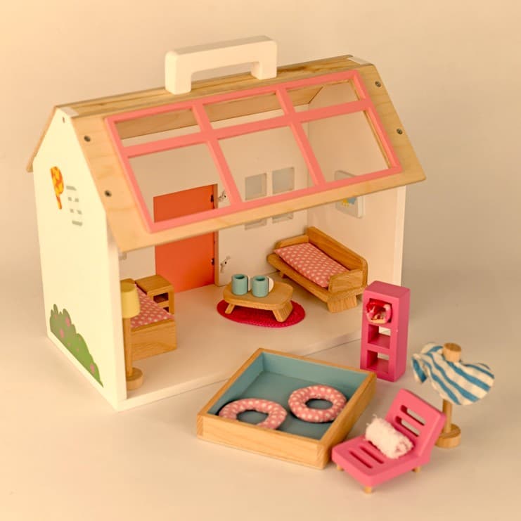 A charming wooden mini dollhouse with pastel pink accents, rooftop design, and poolside fun—perfect for imaginative play or décor.