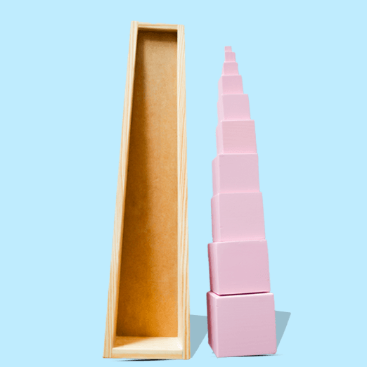 Handcrafted solid-wood Pink Tower rod set with a tidy tower frame. Graduated sticks inspire open-ended building, fine motor skills, and creative play.