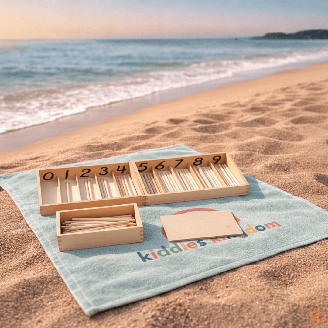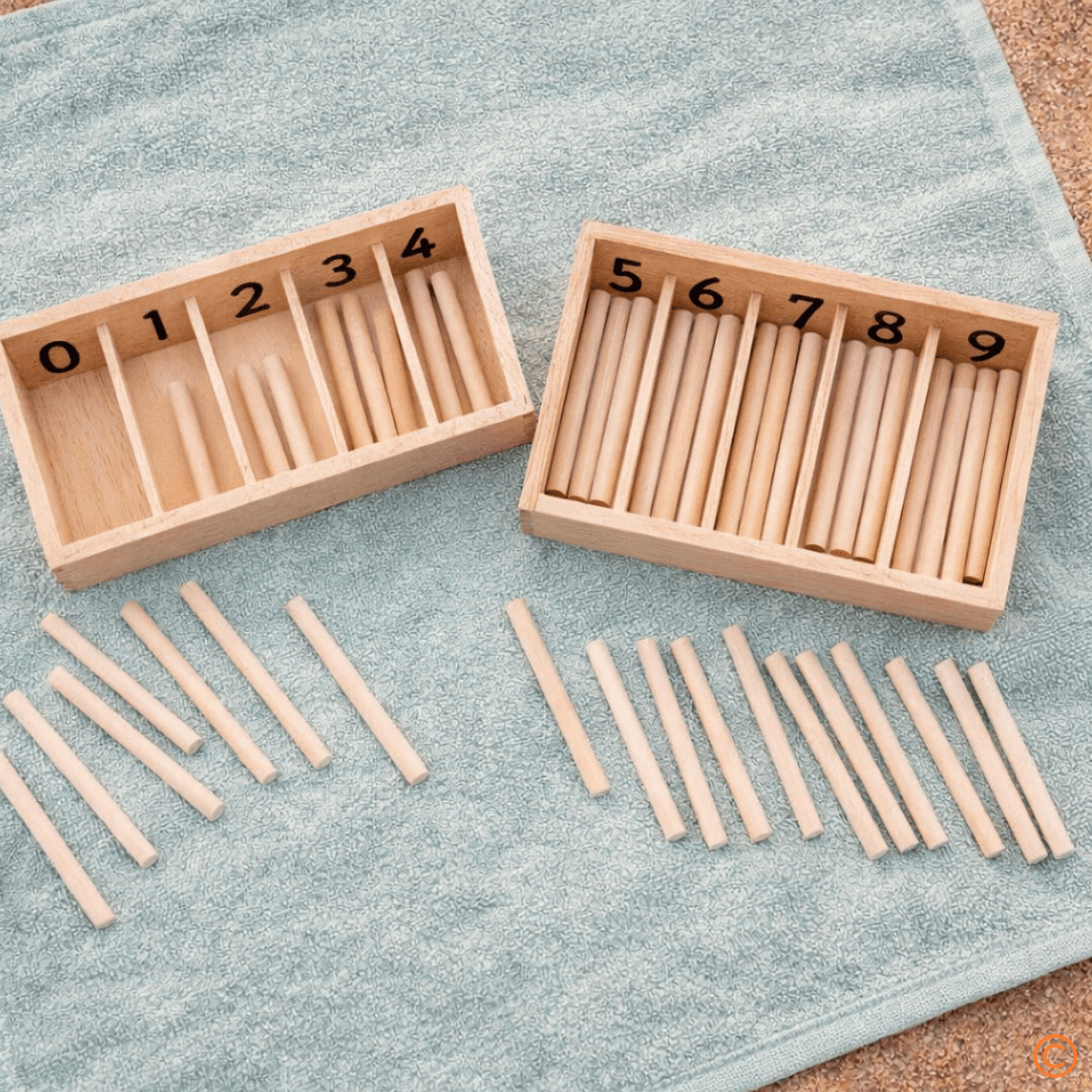 The Montessori Spindle Box is a classic educational tool designed to teach children the concept of numbers and counting. This set includes two wooden boxes, each with compartments numbered 0-9, along with wooden spindles for counting.