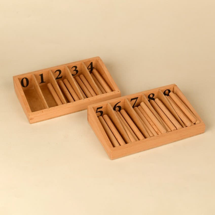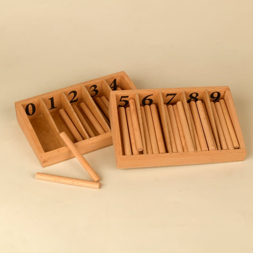 Classic Montessori spindle box set with numbered compartments and wooden spindles for hands-on counting, number sense, and zero concept.