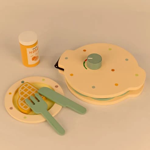 A 9-piece wooden waffle maker set with realistic details that sparks creativity, encourages pretend cooking, and helps improve motor skills.